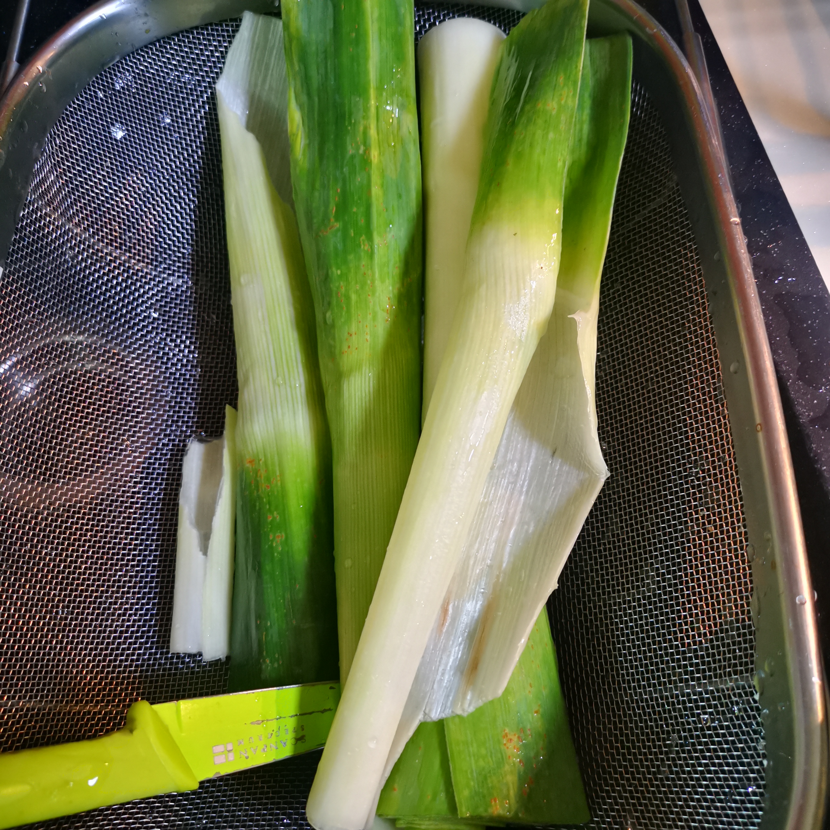 First , clean your leeks leaf by leaf. Remove all the dirt and put it into the strainer.