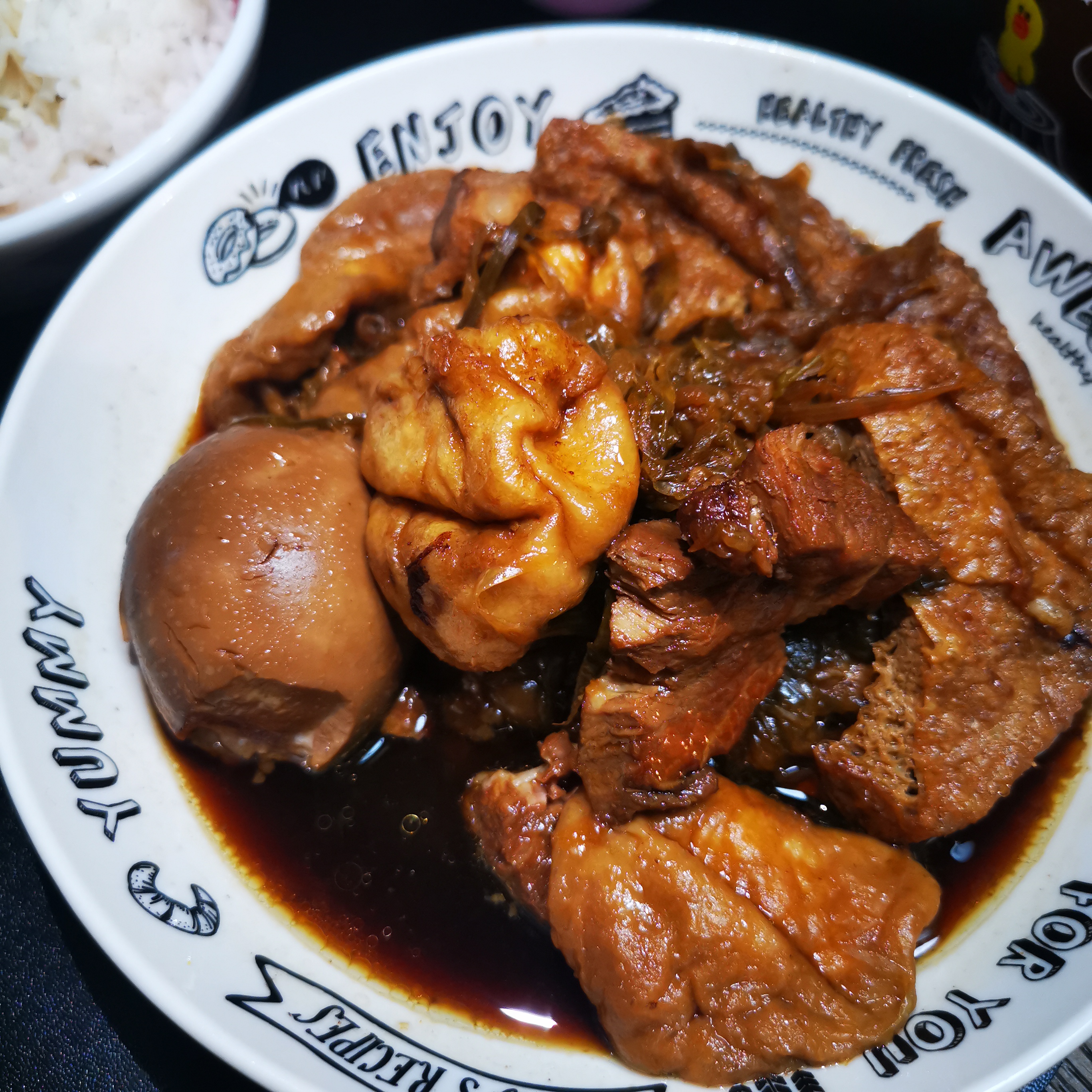 Now add in the sautéed leeks, pour 1400ml of water, add in all the seasonings. When it starts to boil, add your hard boiled eggs, tofu puffs and fried gluten. Cover your wok and let it simmer at low fire until the meat becomes tender, this will take about an hour to an hour and a half. Turn up the heat a bit high to reduce the liquid as to your liking. You may use your thermal pot or slow cooker to cook this dish too.