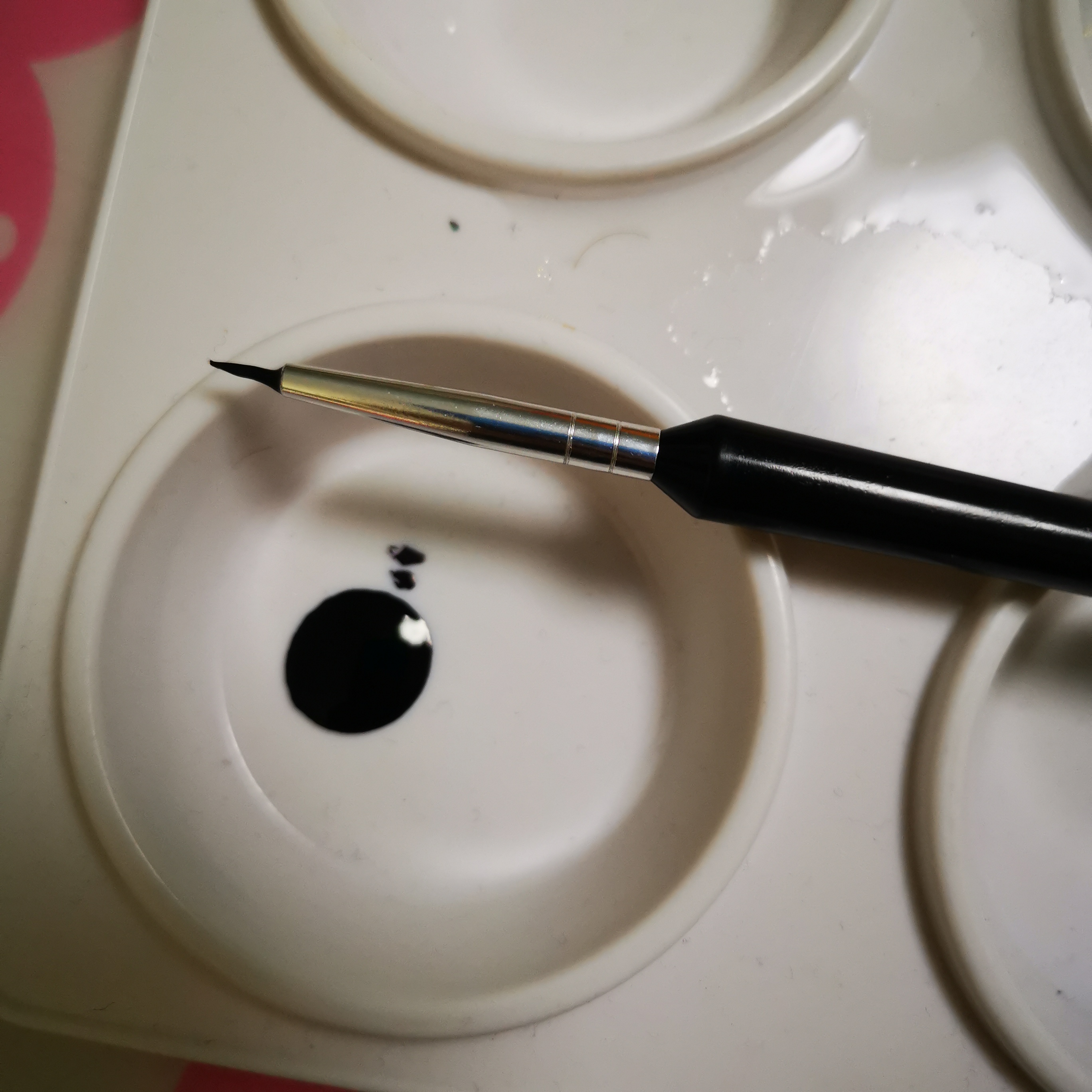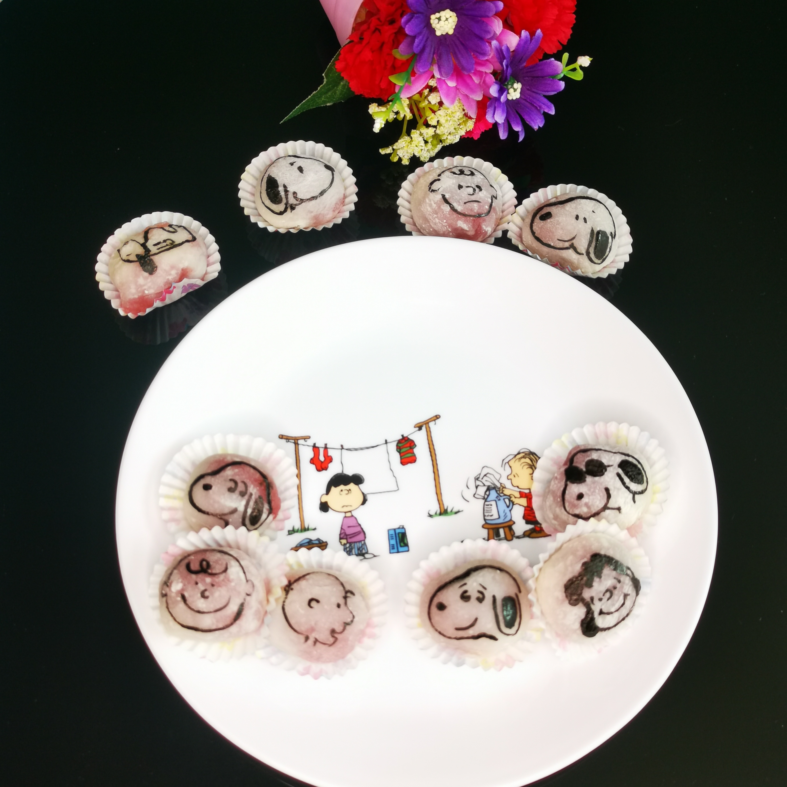 • Use black colour with fine tip brush to draw your character onto the surface of your mochi. You may add clear coloured liquor (40%) to dilute your colour. Adding liquor will hasten up the drying rate of painted surface
