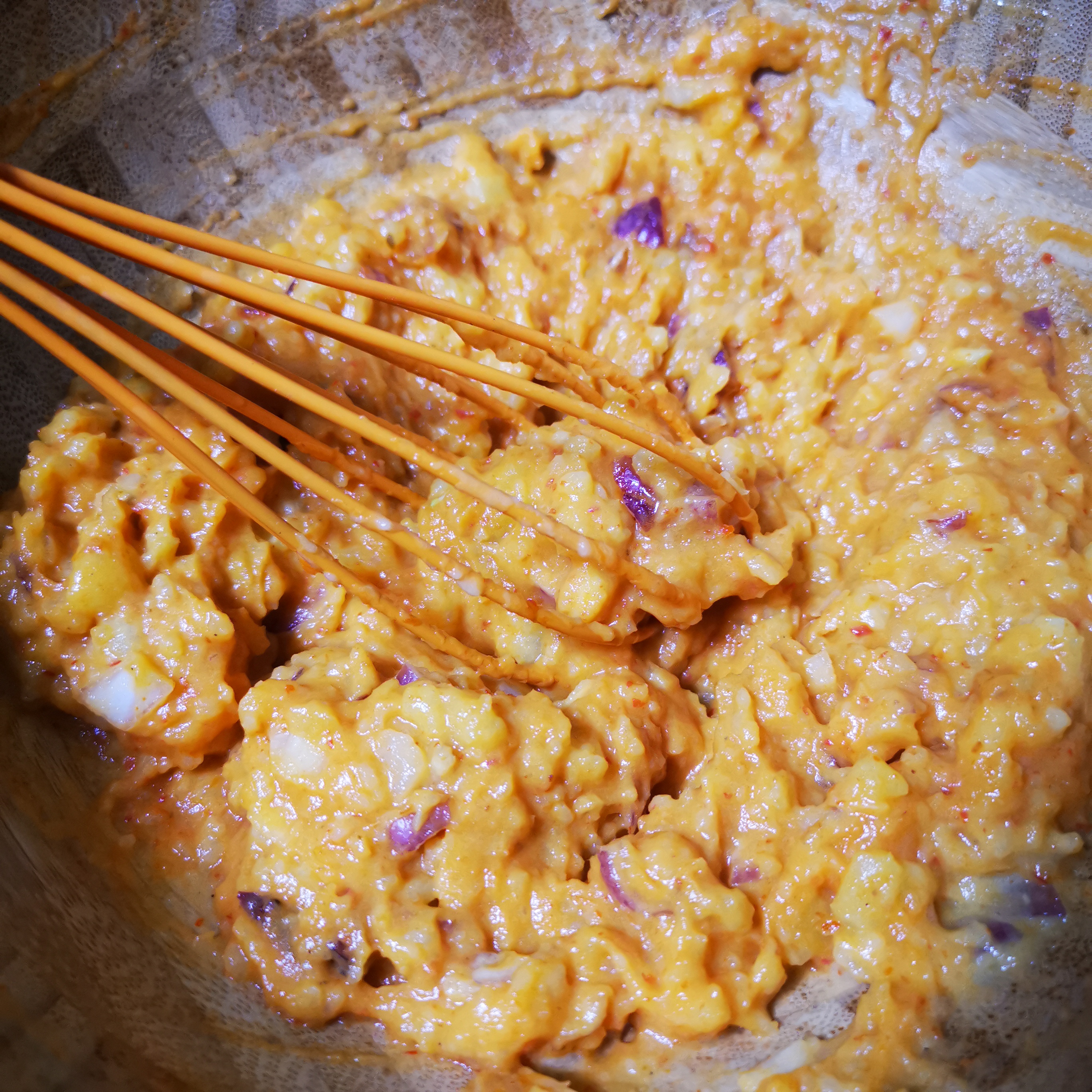 • Add the shallots and yellow onion into your mashed potato. Followed by all the rest of the wet ingredients e.g. eggs, curry paste, olive oil and coconut milk. Stir well to combine.