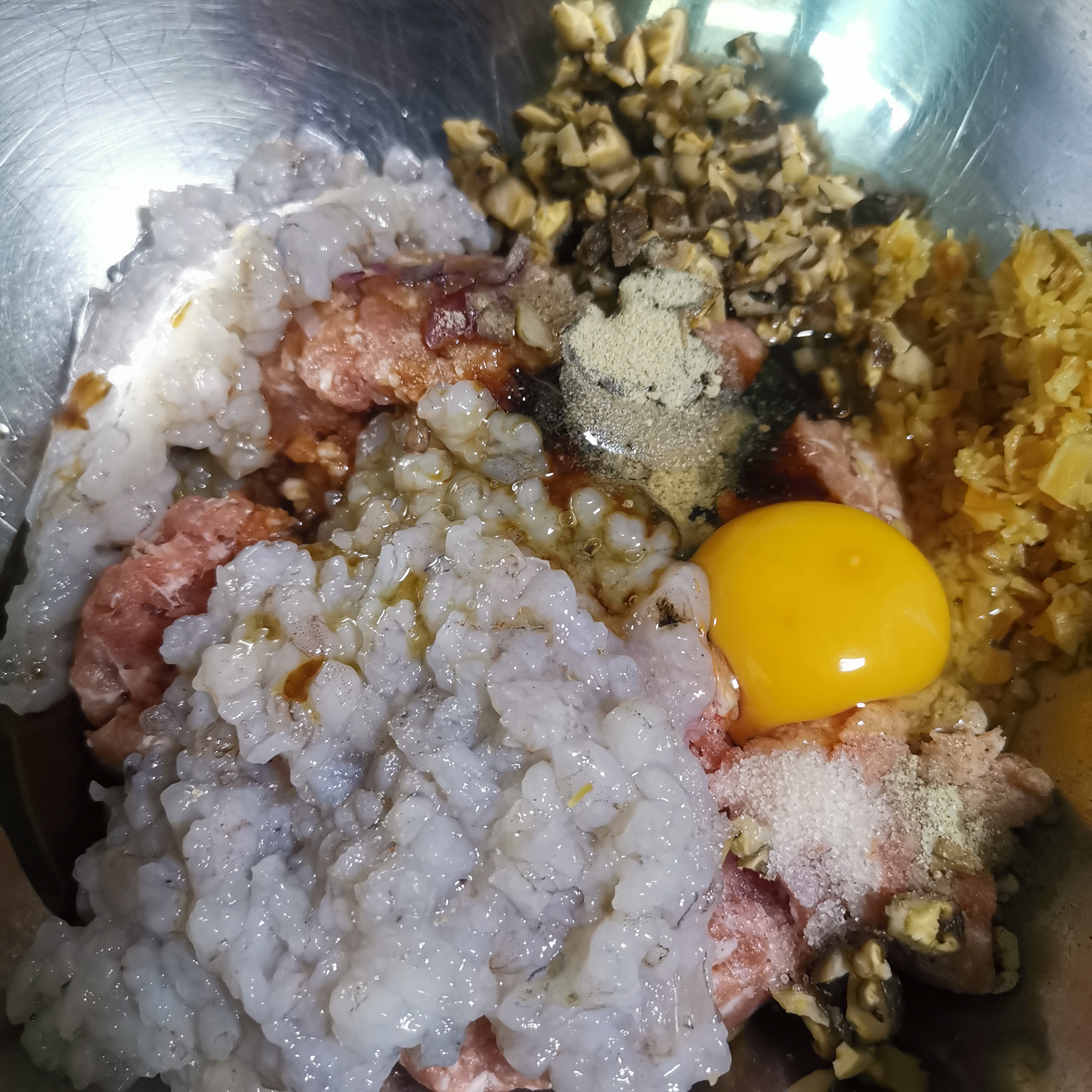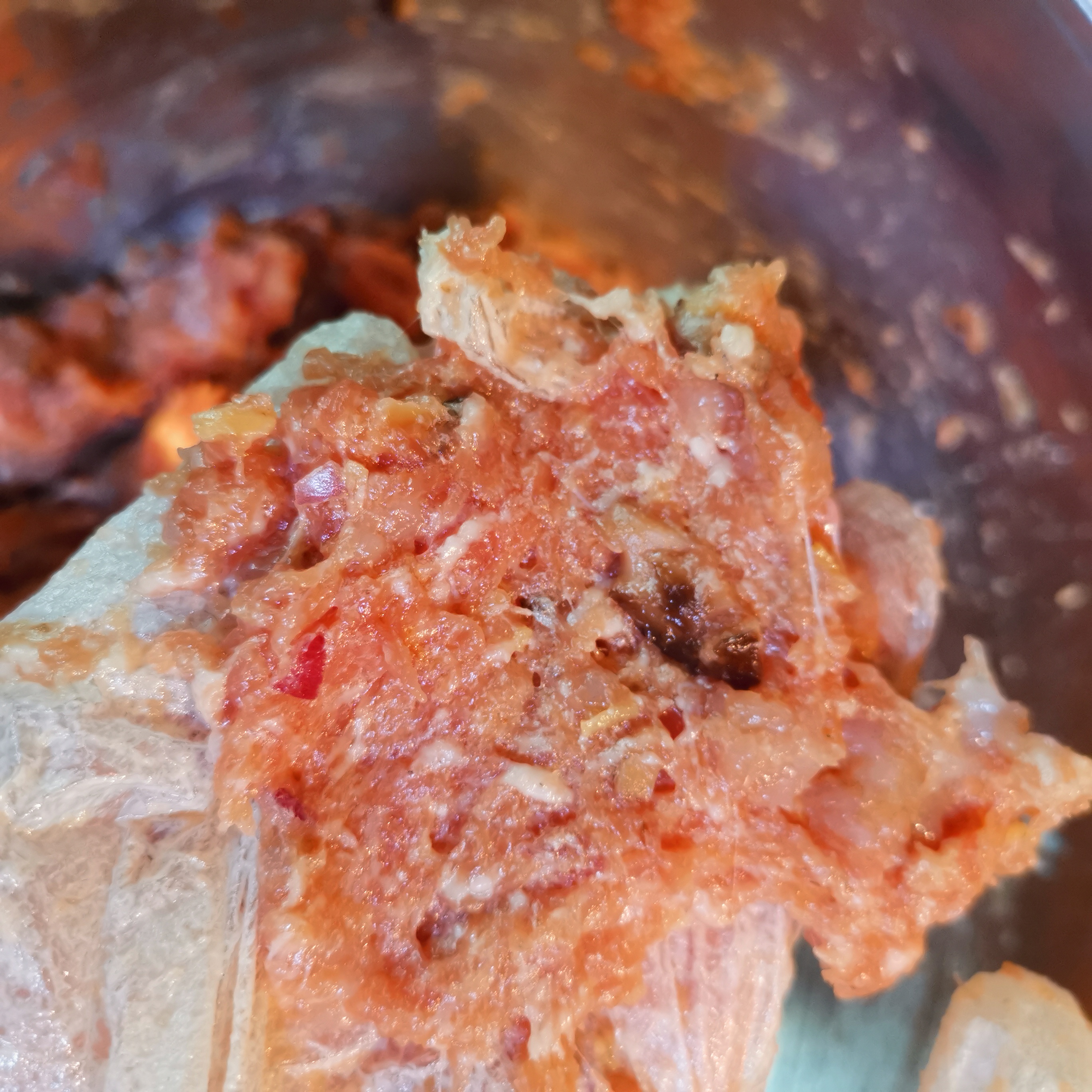 • Add all the ingredients together except the wrapper , followed by all the seasoning except the 6g of liquid used from soaking the dried ingredients