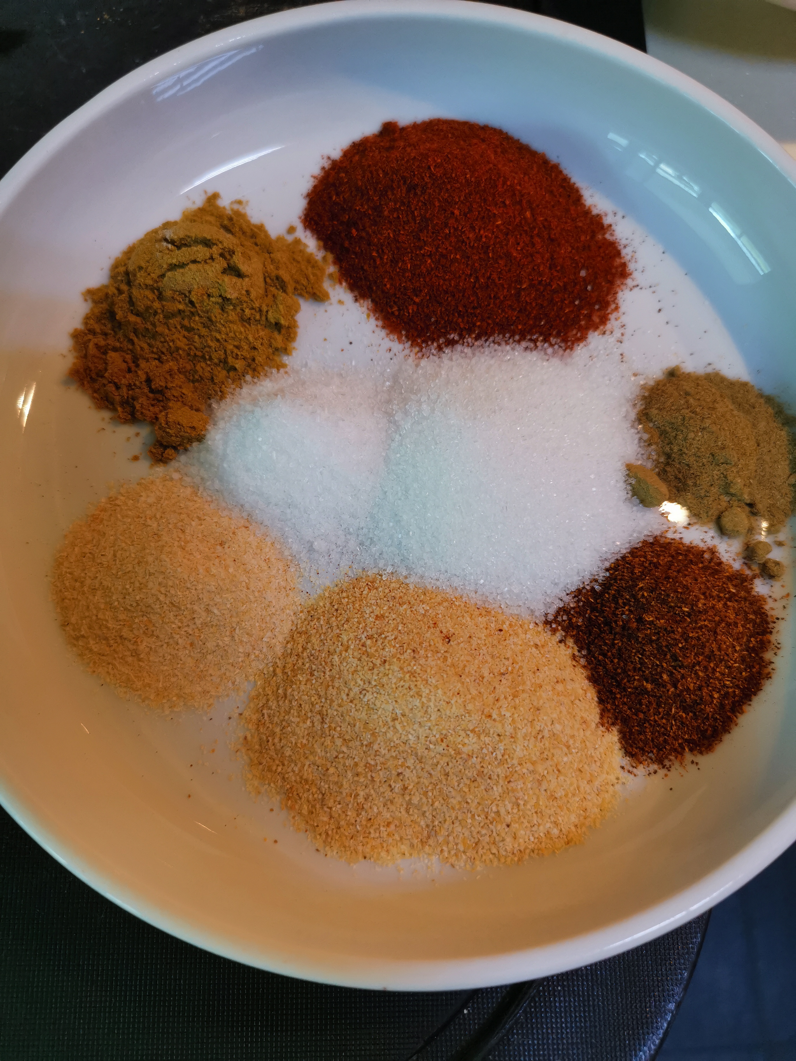• Gently whisk all of your spices, add in your cubes of chicken, season it well until all the pieces of chicken are coated with spices. Set aside.