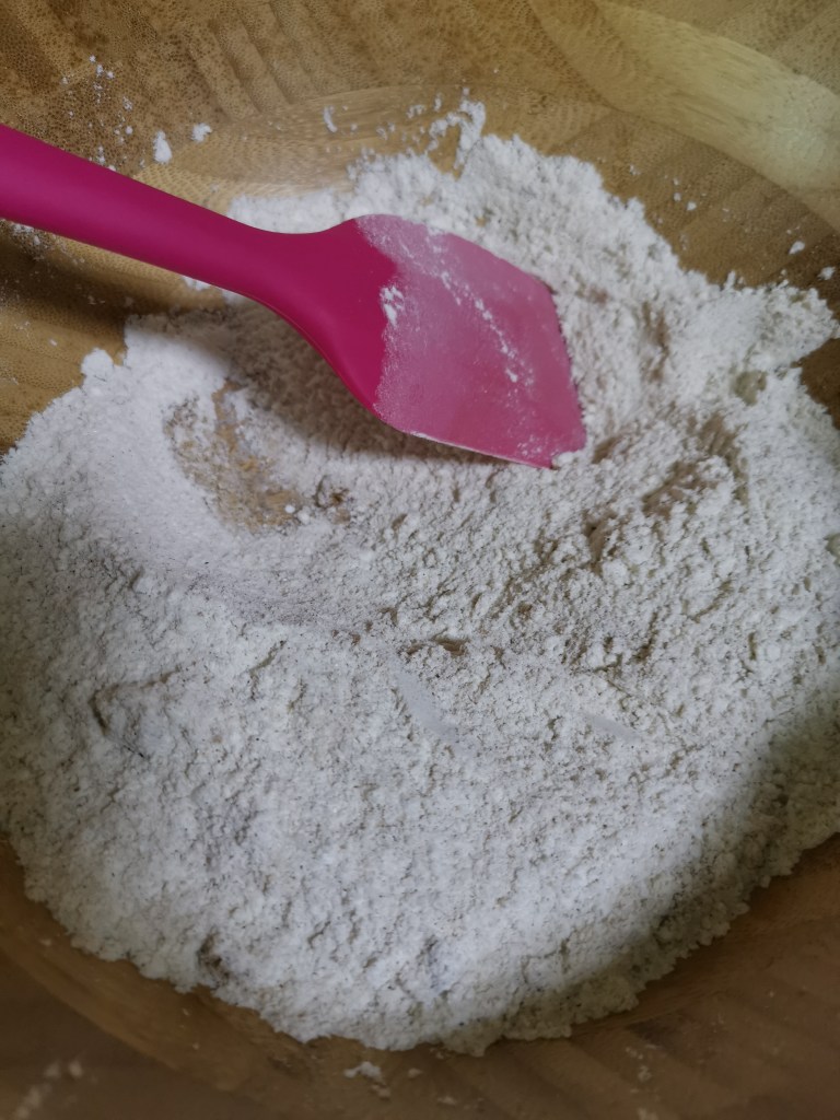 • Sift all the dry ingredients together such as flour, baking powder, baking soda, cinnamon, white sugar, salt, and brown sugar. Gently whisk all the ingredients to combine well. Set aside