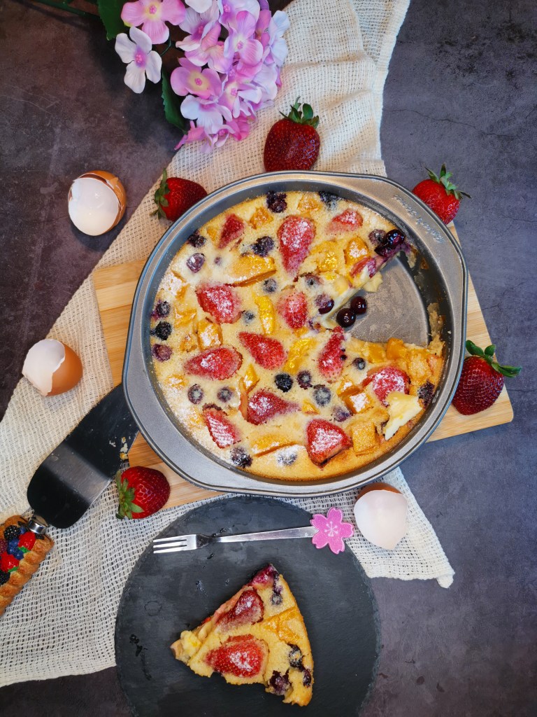 • Bake for about 35-40 minutes, or until the cake puffs up and the centre becomes less jiggly. Note that if you use a smaller dish, you will need a longer baking time