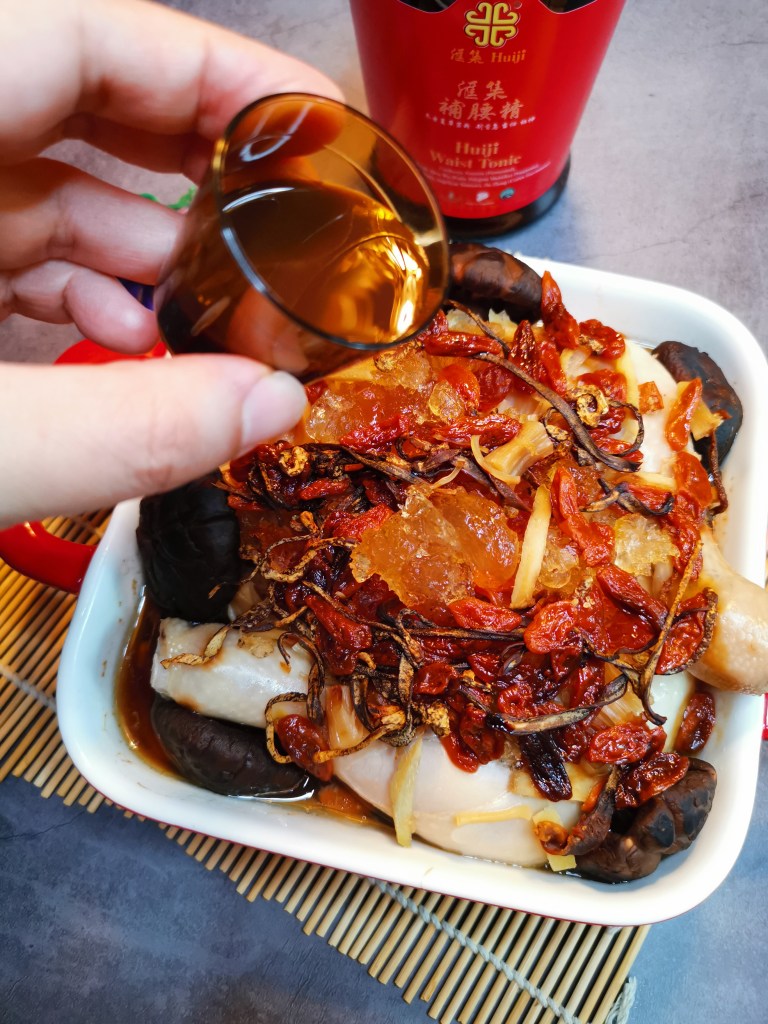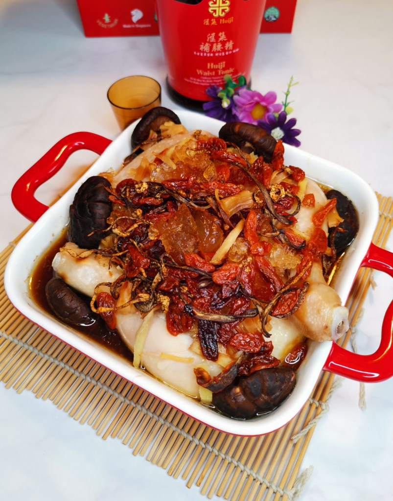 This Steamed chicken is one of the many dishes that my family loves. It is both healthy and easy to prepare. What is more is that with the addition of Huiji Waist Tonic, this dish packed with even more nutrients which makes it an ultimate nutritious dish. This tonic consists of premium quality herbs and vitamins which strengthens both the body and waist, improves complexion, supplements both tendons and bones and even invigorates the spleen and stomach to ensure complete nourishment for your entire body. It is suitable for children 7 years old and above. Its so flavourful and wholesome that even my son wishes that he could be served such a meal in his National Service in the future!