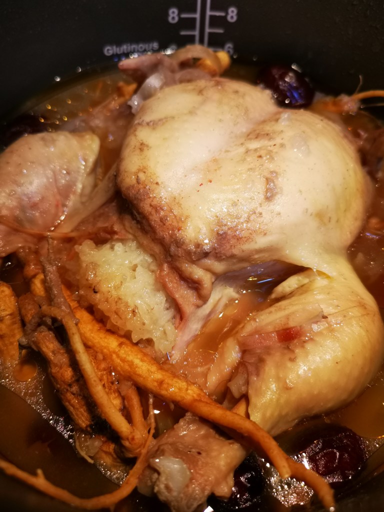 This is a well known nutritious Korean dish that you can easily make at home. It is a chicken stuffed with glutinous rice soup, seasoned with salt, and spiced with dates, ginseng, garlic and onions. Normally I would cook this over a stove, but today I am kind of lazy, and decided to use the “soup” function on my rice cooker. Oh wow! Would you believe how easy it is to cook this way? Just put everything in , press a button and voila! A hearty chicken meal in less than an hour.
