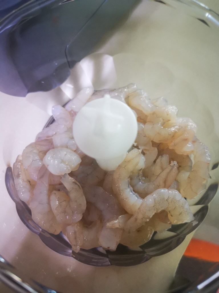 - Put the shrimp into the food processor, blend until it becomes a thick paste, add it into the salmon paste.