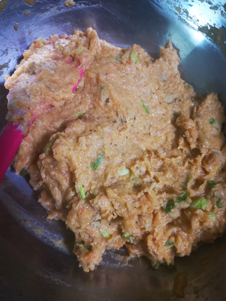 Note 1 : If your food processor is big, you can just add in all the ingredients except the spring onion, and blend until it becomes a thick paste, otherwise you have to do the salmon and shrimp separately and mix the rest of the ingredients in a bowl, which is what I did. Add the spring onion manually into the paste until well combined.