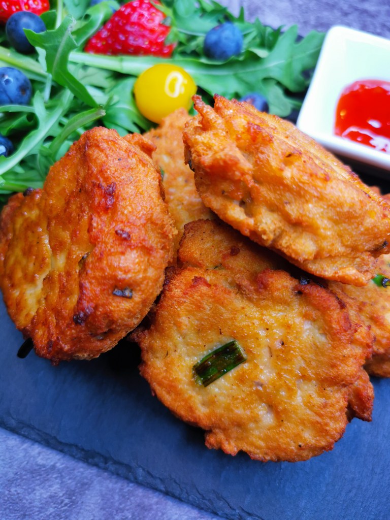- Use a strainer to strain any oil or put it on a plate lined with paper towels. Serve with your favourite sauce. I prefer mine with Thai chili sauce.