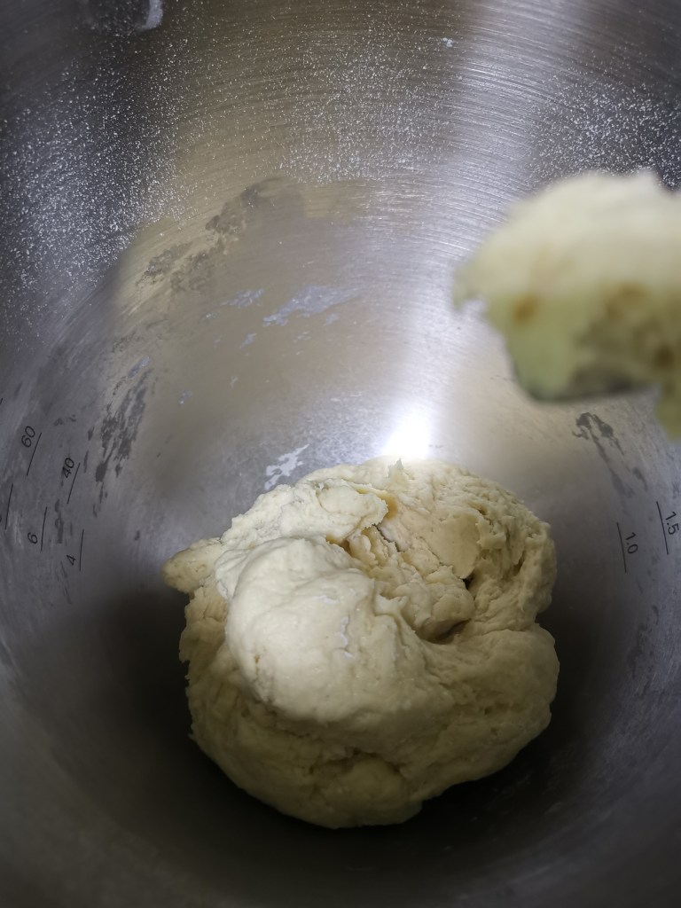 - Mix all the dry ingredients into the mixer, followed by the wet ingredients except the salt and butter. Using dough hook, knead for about 2 minutes at low speed until a dough is formed