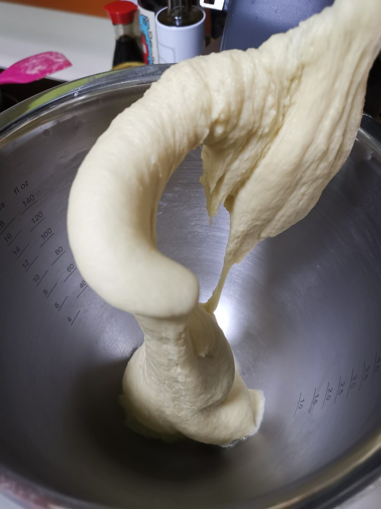 - Add in the salt, and continue to knead until the dough becomes elastic and reaches window pane stage. This will take about 15-20 minutes. (I am using Kenwood Chef XL series)