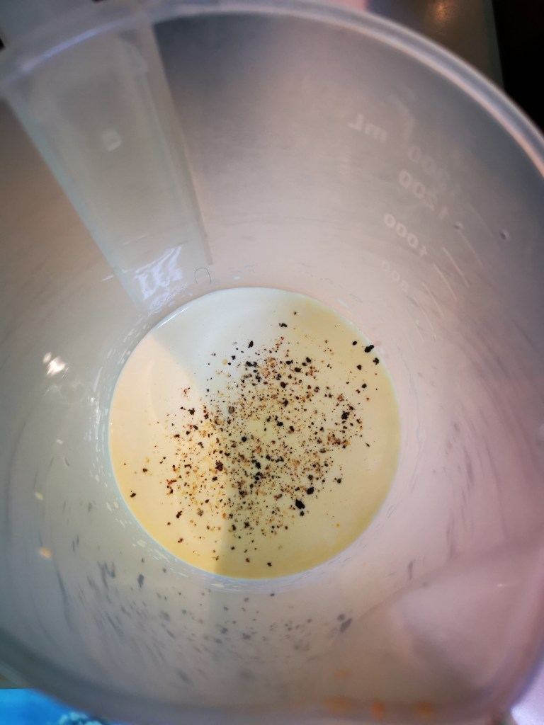- Whisk the egg, whipping cream and milk. Whisk well and sieve to ensure smoother custard. Add the salt and pepper. Mix well. Set Aside