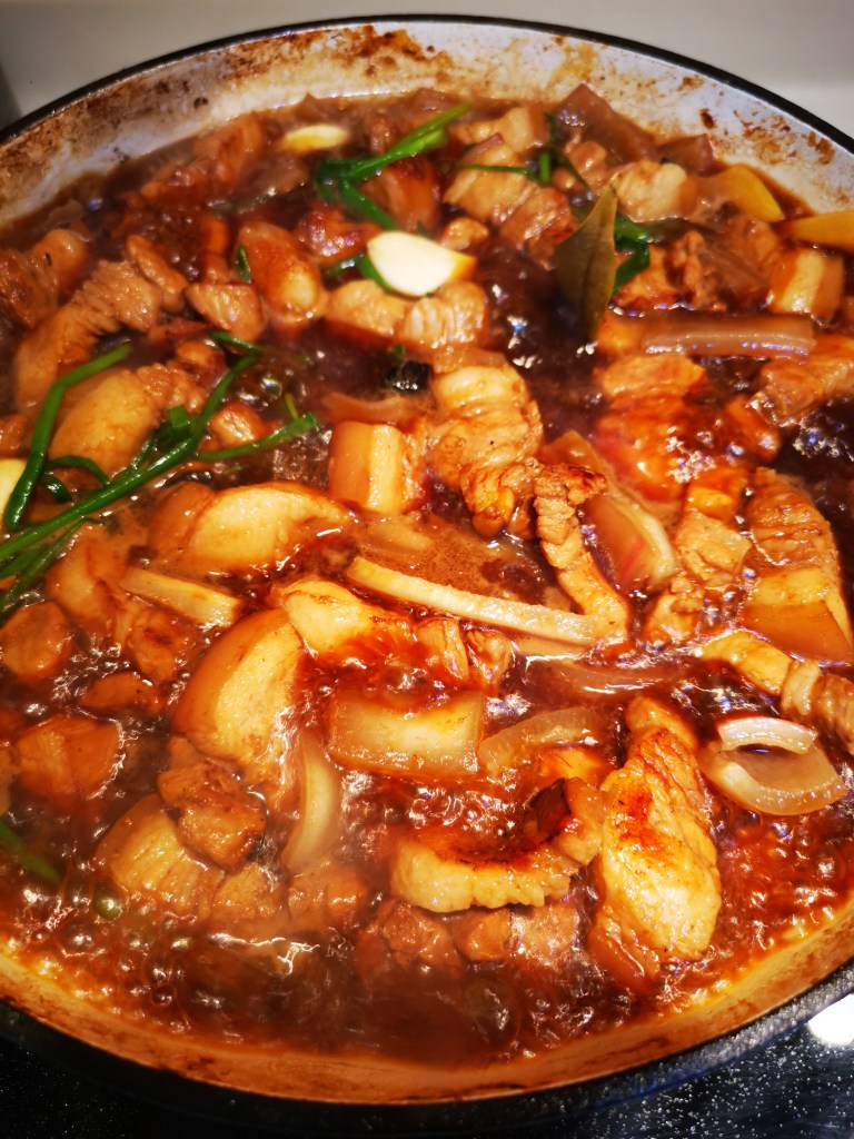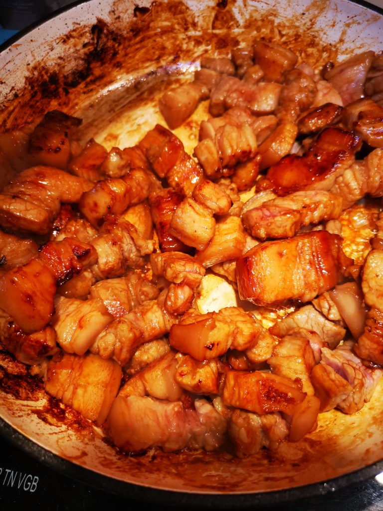- Turn on the fire at high heat to heat up your dutch oven, add in the rock sugar to melt; wait for it to caramelise. As it is starting to turn light brown, turn down the heat to medium high. Add in the meat, let each meat coat some of the caramel. Continue to stir fry all the sides of the meat until it is light brown. Now deglaze the dutch oven by pouring in the Chinese wine. This is will remove the brown bits that would add extra flavour to your dish.