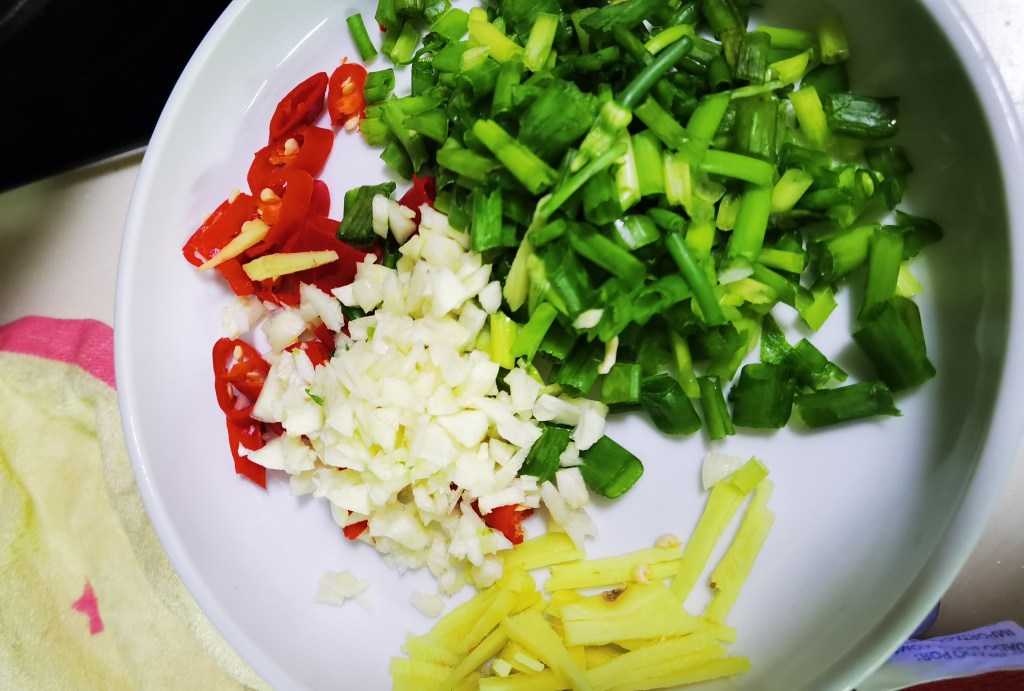 - Remove any brown bits left in the oil and leave about 2 tablespoon of oil in the wok. On medium heat, stir-fry the garlic, ginger, spring onion and chilli until fragrant.