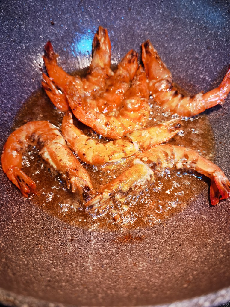 - In a heated wok on medium high heat, add enough oil to shallowly fry the prawn. Test the oil using a wooden chopstick. Bubbles around the chopsticks indicate that the oil is hot enough to fry. Fry for about 15-20 seconds each side or until the prawn shells turn orange. Flip the prawn to the other side to continue frying. Fry until the whole prawn turns orange (take care not to overcook the prawn). Set aside on a plate layered with kitchen towels.