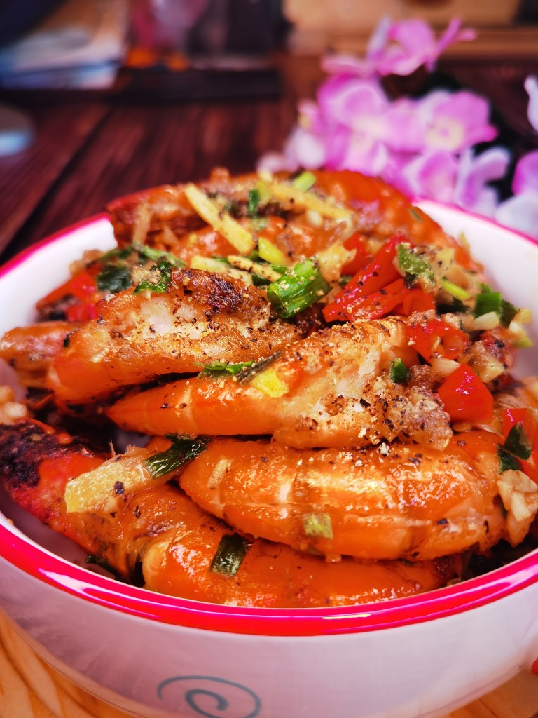 - Turn off the fire and mix the prawn in. Serve on a dish and add a sprinkle of black pepper and spring onion on top.