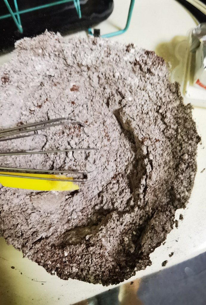 • Sift all dry ingredients together. (Flour, sugar, baking powder, baking soda, cocoa). Whisk and set aside