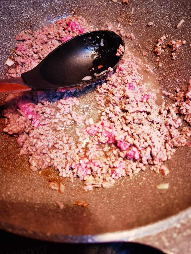 - Add in the minced meat. stir fry until all the meat becomes light brown or cooked through. Break up meat chunks into bits.