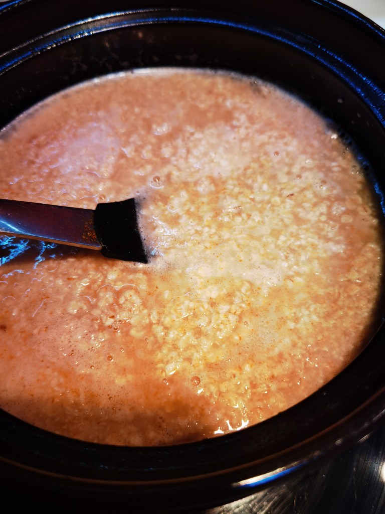 • Add in the oats, stir constantly to prevent lumps. Cook until the mixture slightly thickens
