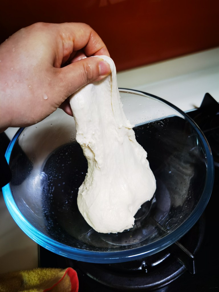 - Add in the salt and continue to knead at speed 2. Knead until the dough is somewhat stretchy. See photo below.
