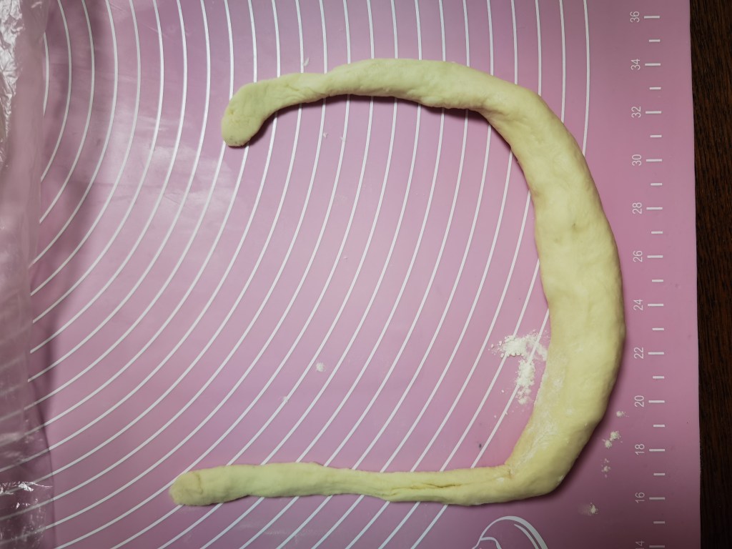 - Roll each dough into long strips where the middle part is thicker than the two end parts. Length should be about 46cm long (See photo below) Note: When the dough shrinks back as you roll, rest the dough for a minute or two, then start rolling again until you reach to your desired length