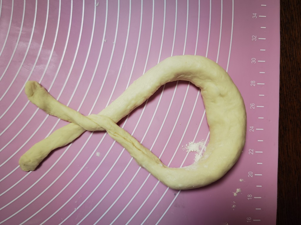 - Twist the two ends together and bring it down to form a pretzel knots. See photo below. Note, sprinkle some flour on your baking sheet before you put your pretzel.
