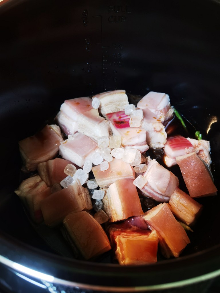 • Lay the sliced spring onion into the pressure cooker pot, followed by the sliced ginger, then the meat chunks. Pour all the seasoning in, followed by the rock sugar