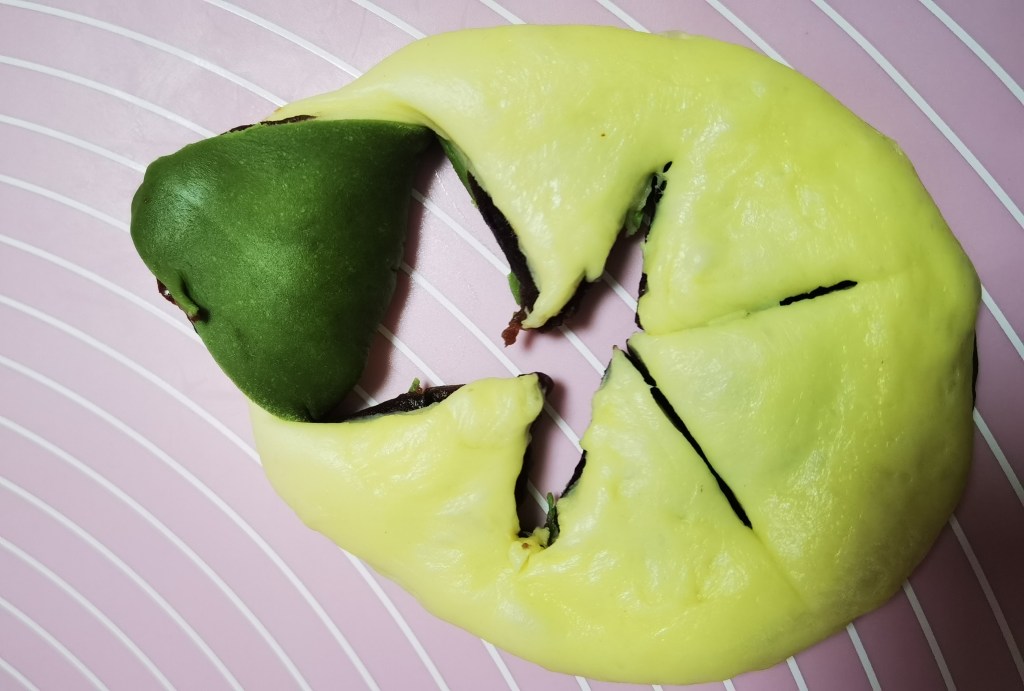 • Flatten the dough and roll it into 10 cm diameter. Then roll the matcha dough to 10 cm diameter as well. Stack the green dough on top of the sweet bread. Flip the stacked dough and make slits with the help of a sharp knife and scissors. See photo below. Do the same for the rest of the dough. Cover and let it rise to double. This will take about an hour and half, depending on the temperature and humidity of your environment. Don’t be fixated with the time frame as long as the dough rises to double, it is good to go.