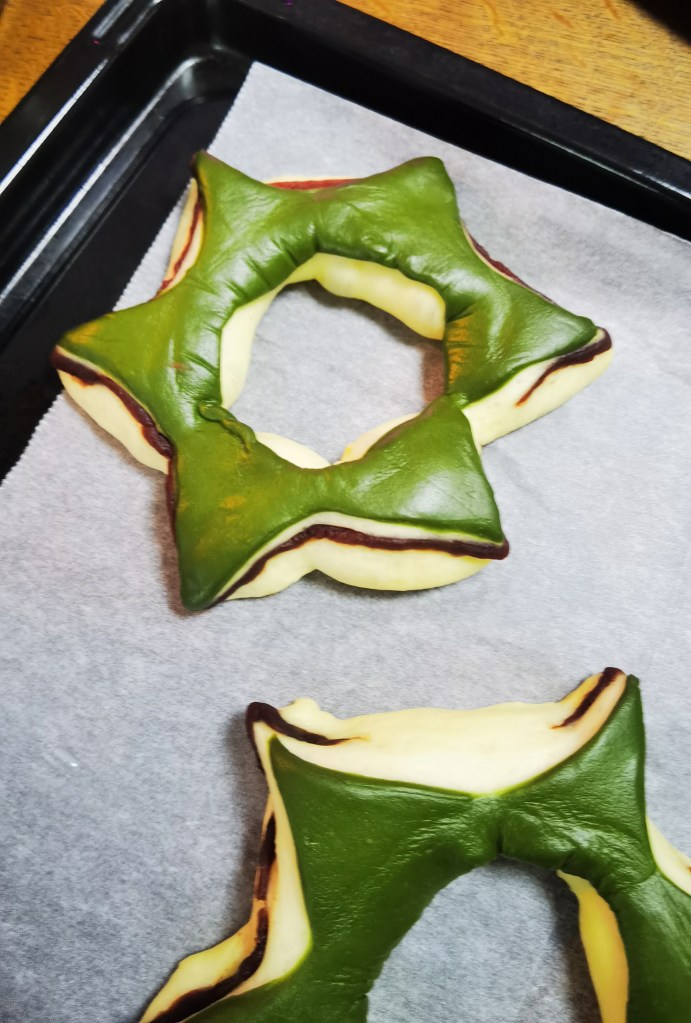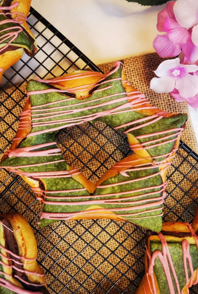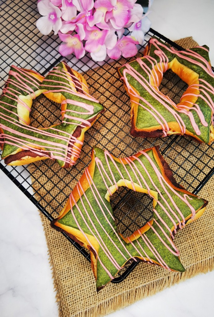 I love stars, sometimes when the night sets, I will look out the window and search for the stars. For me, stars signify hope. Especially in the darkest of nights you can still see the stars shining bright, telling us not to give up even in our hardest moments. So today, through my inspiration, I made these starry Matcha bread. The red bean is enveloped with the sweet bread and topped with Matcha crust, then drizzled with a decadent Ruby Chocolate.