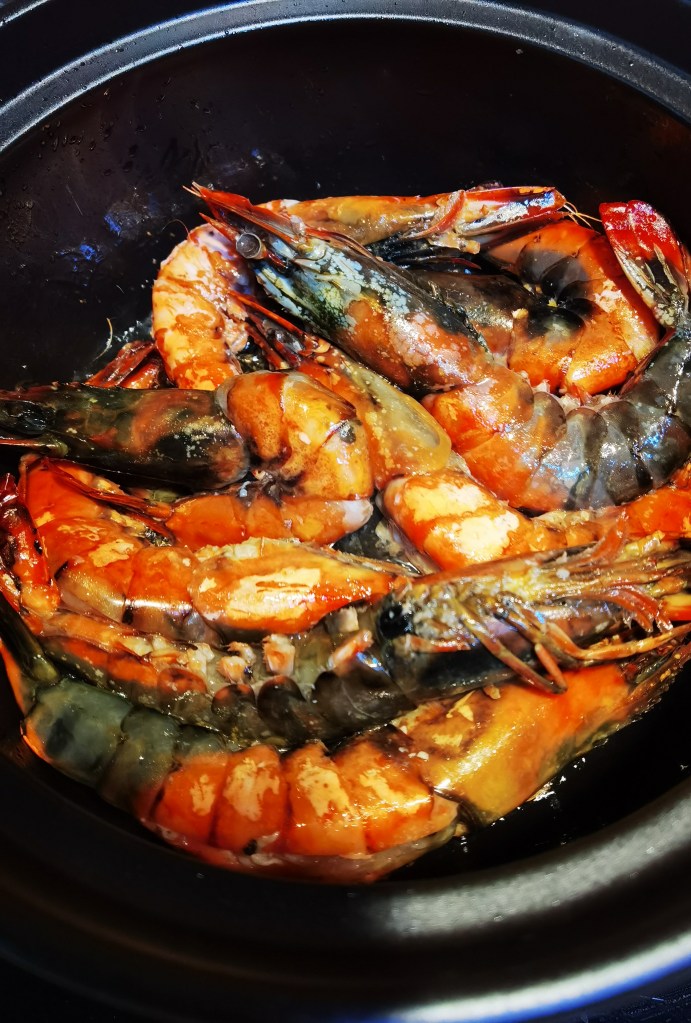 - Heat up the claypot at medium high heat, drizzle the 1/4 cup oil. Fry the prawn until it is about 80 percent cooked before taking it out. Leave the prawn oil in the claypot to stir fry the rest of the ingredients .