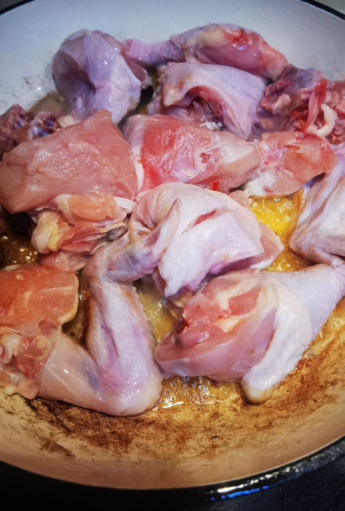 • Add in the butter. adjust the heat to medium low, add the chicken parts, pan fry the chicken until both sides are brown