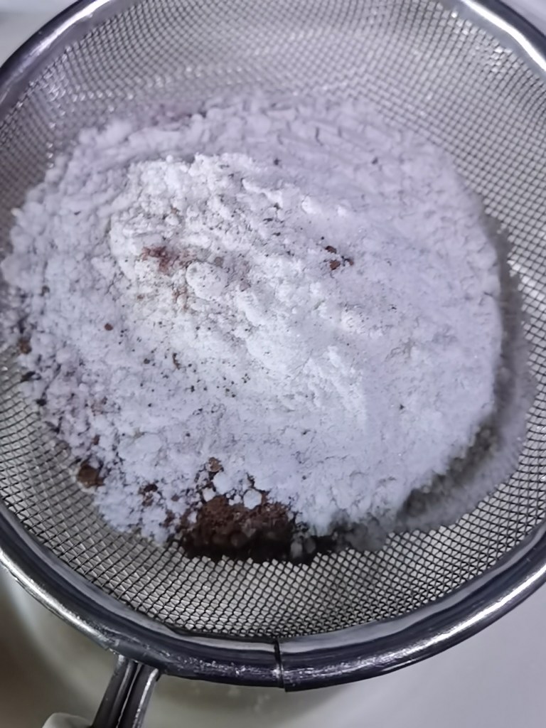 • Sift all the dry ingredients together (flour, baking soda, sugar, salt and cocoa). Gently whisk to distribute the ingredients evenly.