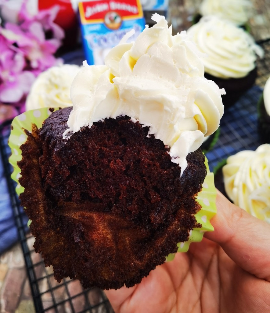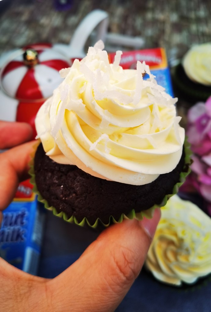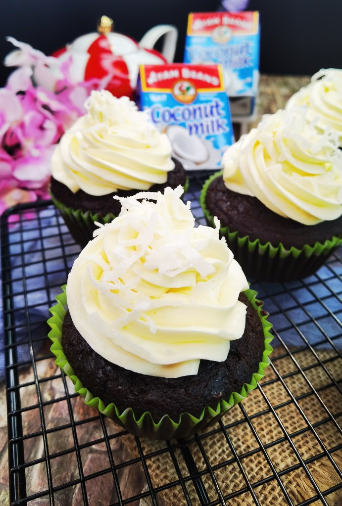 Using my basic chocolate cupcake recipe as a base, I made a few tweaks to come up with this new rendition! Voila! Introducing my coconut chocolate cupcakes. They are pretty tasty and would make a great party treat. I adjusted the sweetness of the cupcake so that it would not end up too sweet when eaten together with the frosting. I also used Italian buttercream instead of American. It takes a little bit more steps to make but it is less sweet in comparison with American. In the case you do not plan to add frosting, I would suggest for you to slightly increase the sugar and add some chocolate chips.