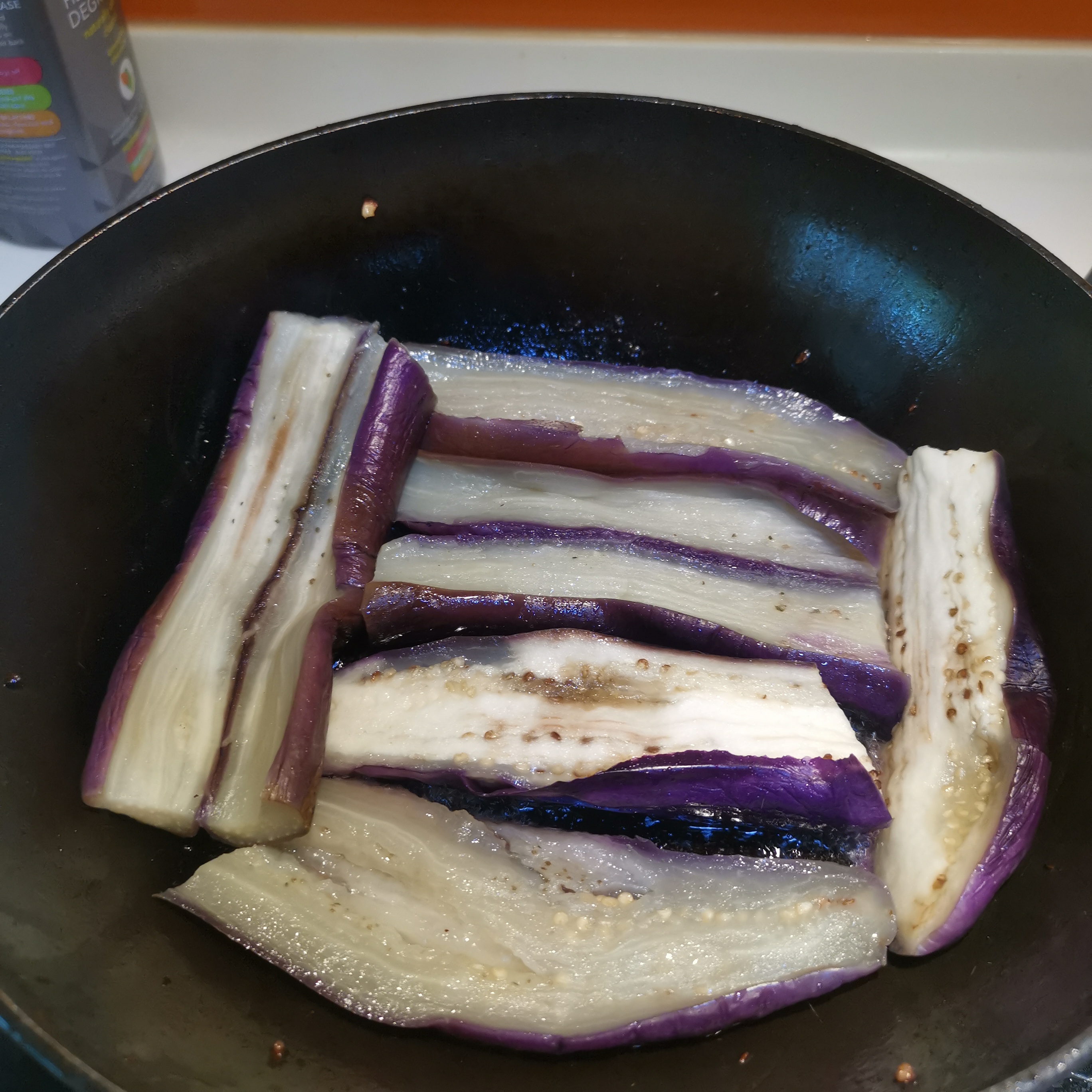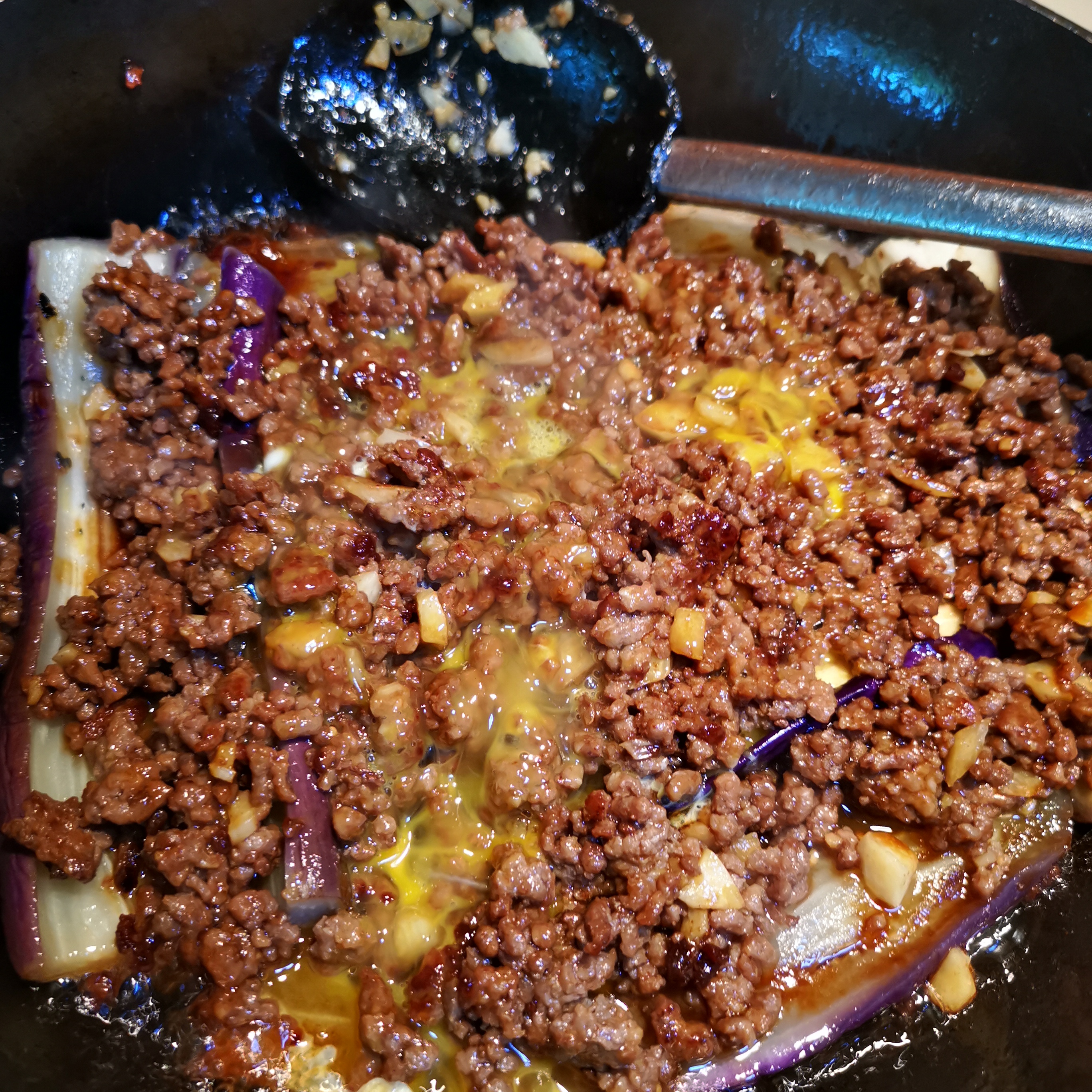Using the same wok, drizzle 3 TBS of oil, lay all your eggplants flat onto the wok. Then evenly spread out your minced beef over your eggplant, pour your beaten egg on top, drizzle the last tbs of soy sauce over the egg. Cover your wok for about 2-3 minutes until the eggs are set. Garnish some chopped spring onions