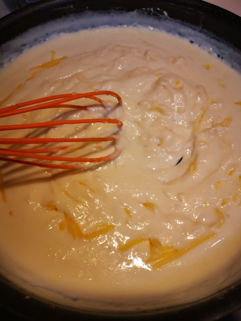 • Turn heat to low and add the cheese. Whisk until all the cheese has melted. Set aside