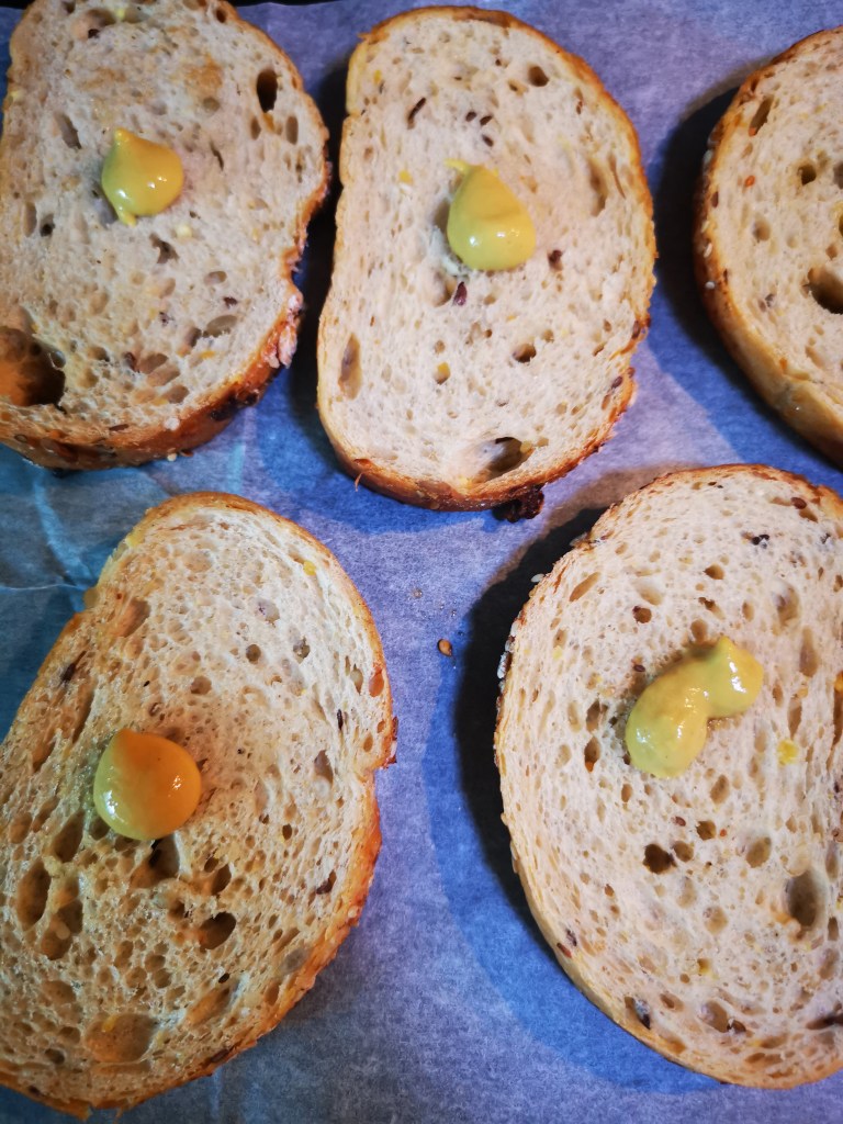 • Spread a thin layer of mustard, then the béchamel sauce on the bread
