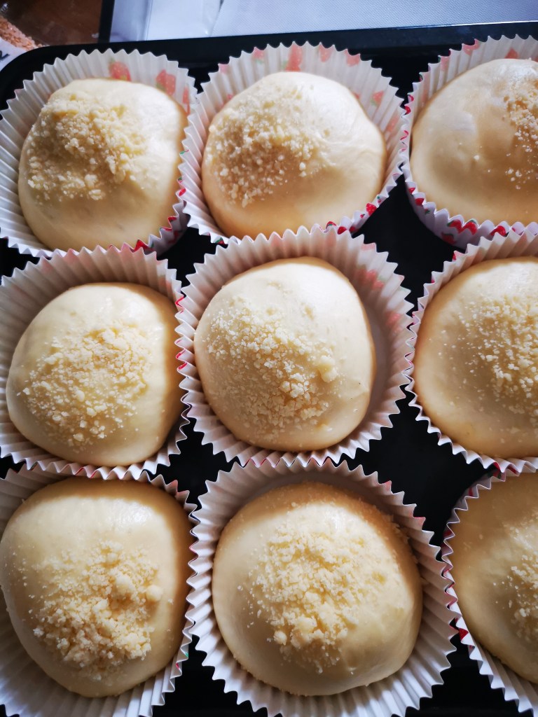 - Brush the buns with egg wash , then sprinkle with sugar on top