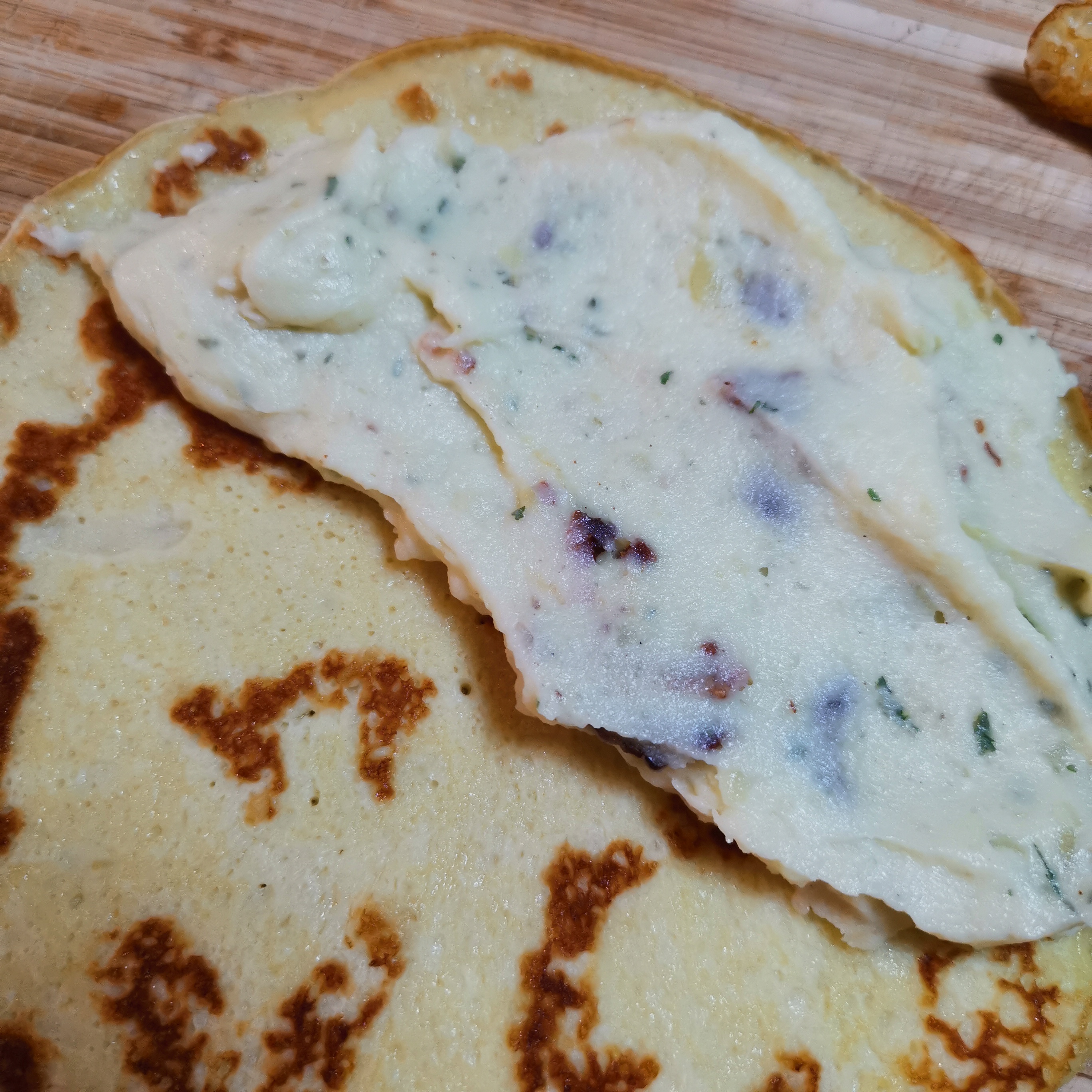 - when the sides start to brown, flip the crepe to the other side. Cook for about 10 seconds